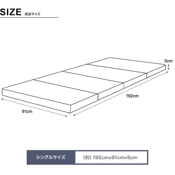 高反発マットレス 四つ折りタイプ 5cm シングル [密度24D/硬さ150N] 商 品 詳 細 サイズ (約)192cm×91cm×5cm シングルサイズ 材質 側地 : ポリエステル100% 中材 : ウレタンフォーム 硬さ 150ニュートン (かため) 密度 24D 特記事項 ※製品の臭いが気になりましたら、風通しの良いところで脱臭してください。