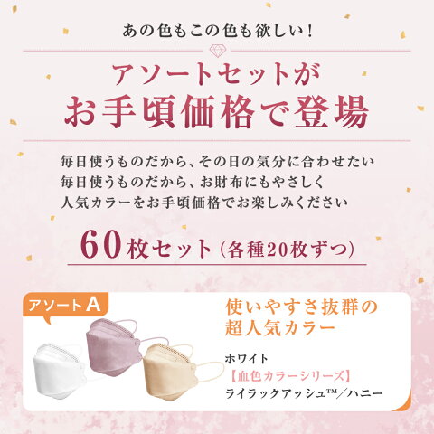 ノーズワイヤーが鼻周りをしっかりと固定するので、空気の漏れが少なく、メガネが曇りにくい! 口紅などもつきにくく、肌の摩擦を軽減するので、メイク崩れが気になる女性にもオススメです! 商 品 詳 細 内容 マスク 60枚入(各カラー20枚ずつ) カラー 【アソートA(人気カラーセット)】 ・ホワイト ・ライラックアッシュ ・ハニー 【アソートB(血色カラーセット)】 ・ライラックアッシュ ・ローズ ・ベリーチューリップ 【アソートC(シャーベットカラーセット)】 ・ミスティサボン ・ミントミキサー ・アイシーミモザ 【アソートD(メロウカラーセット)】 ・ブラック ・ダークグレー ・ネイビー ※※「サイズ×カラー/シリーズ・商品名」内において※※ 「ミスティサボン」は「シャーベットカラーシリーズ ミスティサボン」 「ミントミキサー」は「シャーベットカラーシリーズ ミントミキサー」 「アイシーミモザ」は「シャーベットカラーシリーズ アイシーミモザ」 「ベリーチューリップ」は「血色カラーシリーズ ベリーチューリップ」 「ミルクティースモア」は「血色カラーシリーズ ミルクティースモア」 「ライラックアッシュ」は「血色カラーシリーズ ライラックアッシュ」 「ローズ」は「血色カラーシリーズ ローズ」 「ハニー」は「血色カラーシリーズ ハニー」 のことを指します。